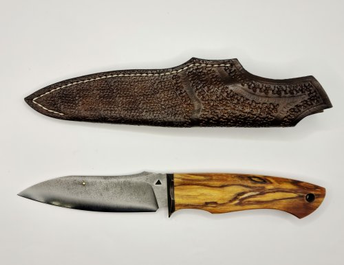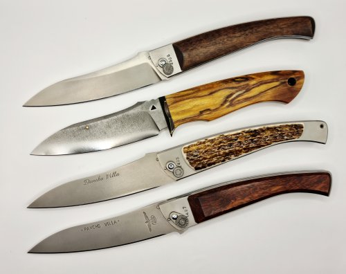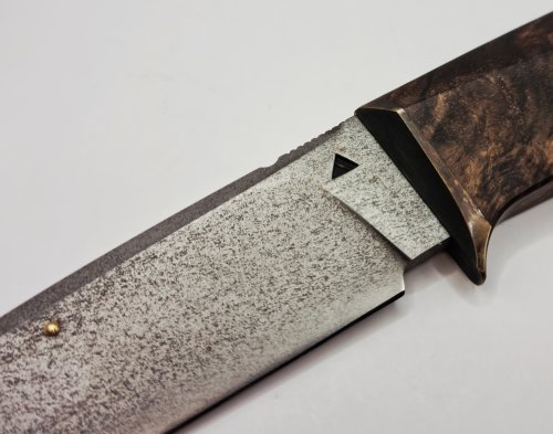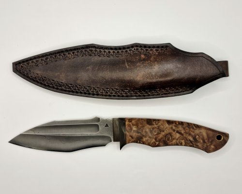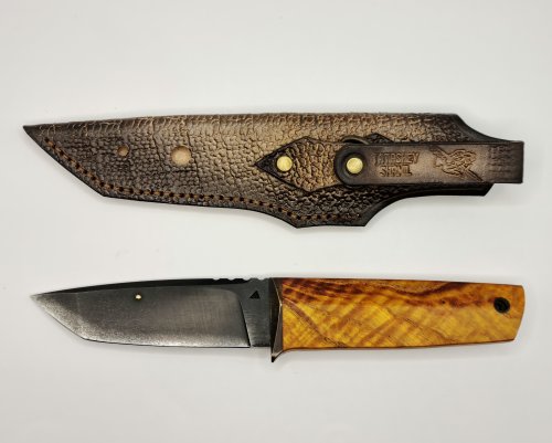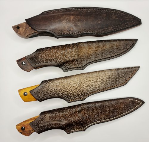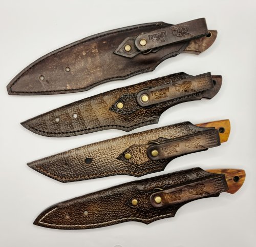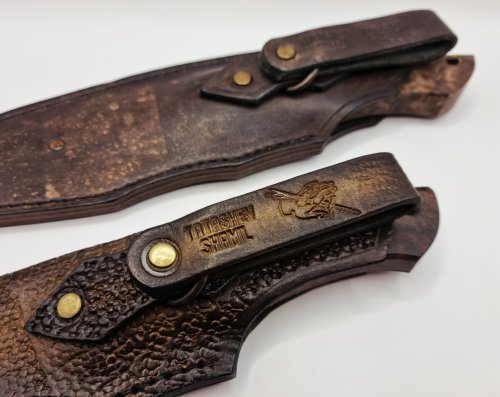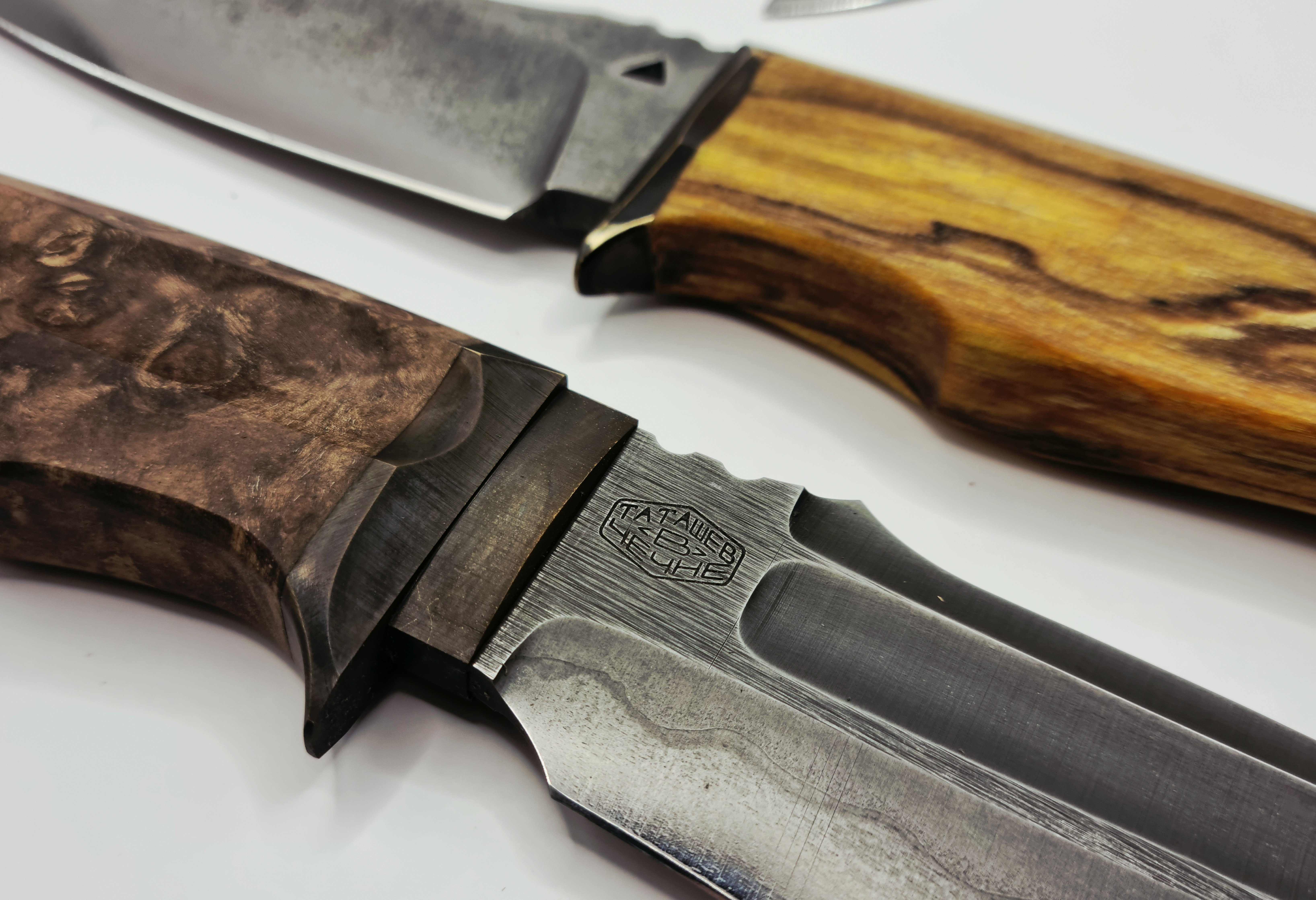 Коллеги, доброго осеннего дня! Сегодня хотелось бы создать тему и немного рассказать о мастере Шамиле Таташеве из Чечни. Ножи делает более десяти лет, и на сегодняшний день, его изделия имеют, не побоюсь, этого слова, безошибочно узнаваемый стиль. Для клинков использует исключительно кованую 65Г, в основном с зонной закалкой. Правда в последнее время, насколько я знаю, обкатывает и 440С. Для рукоятей используются натуральные материалы: кость, рог, но более всего дерево, в частности стабилизированные капы и шпальты разных пород. От карельской берёзы до экзотических сортов. Монтаж чаще всего всадной, но бывает и накладной. Сборка, слесарка, шлифовка и весь финиш в целом- на очень высоком уровне, достойном лучших кастомных мастеров. Ножны также полностью шьёт и отделывает самостоятельно. Клинки его ножей имеют достаточно необычные формы, встречаются комбинированные спуски, "ломанная" линия РК, долы "на вылет", комбинированный финиш (он же гринд) и иные особенности. При этом присутствуют и ножи в более классических дизайнах. Рукояти также имеют довольно непривычные формы, но при этом, вполне эргономичны и удобны. Говорю про это исходя из знакомства с четырьмя моделями. На большинстве клинков имеется интересная особенность- т.н. "латунная родинка". Я такое встречаю впервые. Мастер имеет два вида клейма на клинках (треугольник и "ТАТАШЕВ В ЧЕЧНЕ"); что касается второго, то оно было создано при активном участии А.И. Уракова, с которым Ш. Таташев состоит в очень хороших отношениях, и даже вместе выставляются (на одном стенде) на выставках. Помимо этого на ножнах и других кожаных изделиях находится своё клеймо. На всех ножнах выполнены отверстия для вентиляции. Всё это отразил на фото. Далее приведу фото четырёх изделий, которые я заказал у мастера и недавно получил. Названий у ножей нет, т.к., по большому счёту, нет строго фиксированных моделей. Все экземпляры делаются индивидуально и могут немного отличаться друг от друга. Хотел бы обратить внимание, что у одной из моделей форма клинка вдохновлена клинком ножа Уракова "Панчо Вилья". Соответствующее фото также имеется. Также отмечу, что Шамиль в курсе нашего форума и то, что я создаю тему про его ножи, активно с ним переписывались в последние дни. Возможно, со временем, он и сам сюда зайдёт. С Текстом пока всё, далее выложу фото. Ну и постараюсь периодически пополнять тему. Если у кого есть что добавить- то отлично. Также прикладываю ссылку на статью про мастера: https://etokavkaz.ru/redkii-spetcialist/eto-tvorchestvo-i-ya-vybirayu-ego Благодарю за внимание. Всем хороших выходных.