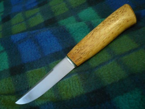 Всем Здрасте! Клинок~92~19~2,5мм.Сталь -откованая цэркулярка (со-слов) -по твёрдости сравнима с быстрорезом-полотном(ну мало-мало послабже и нержа.).Спуски прямые практически от обуха и "нахренато" фальш-лезвие зализаны грани умышленно(обмылок эдакий ). Рукоять~109~28~20мм.Деревяшка-ветка карелки (со-слов) -латунь,мочалка-фибра.Монтаж всадной на 2/3 на эпоксу.Эпоксой же и "протёр" после льнянки . Ножен покамест нет... ВСЁ! -ЗАРЫЛСЯ В СНЕГ-ЛОВЛЮ МЕБЕЛЬ