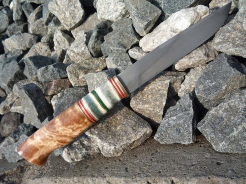 Здравия Всем. Сделан был хор. человеку "под рыбалку". ТТХ...примерно под линеечку...К:140/22/2,5 спуски прямые+фальшьлезвие,Р:120/32/20 Кап берёзы под льнянку и мастику.Больстер-бронза какая-то. Ловлю мебель :) желательно конструктивную. Пи.Си. Ножен небыло пошито-хор.человек сам руки в дело запустить собирался :) Пи.Пи.Си. Нож уже был выложен однажды на обсуждение...хотелось бы узнать"местное" мнение.