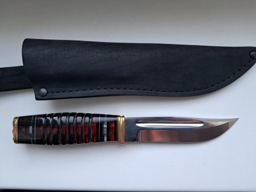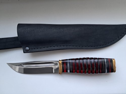 Нож ручной работы с наборной рукоятью, с клинком Николая Кашина, сборка мастера из Москвы. Клинок аус-8 (аналог), длина 11 см, ширина 20мм, толщина 4 мм в самом толстом месте. Ножны кожа, рукоять 105 мм. Цена 9500 р. С моей почтой по РФ.