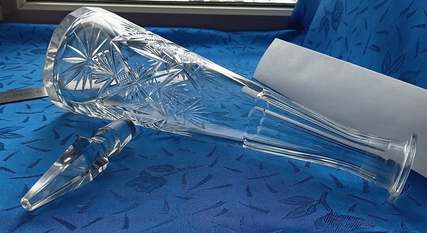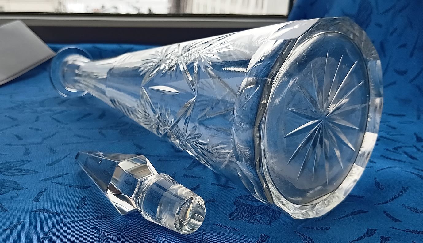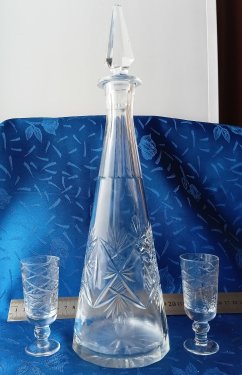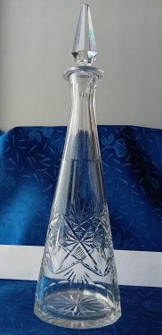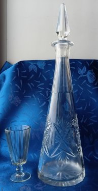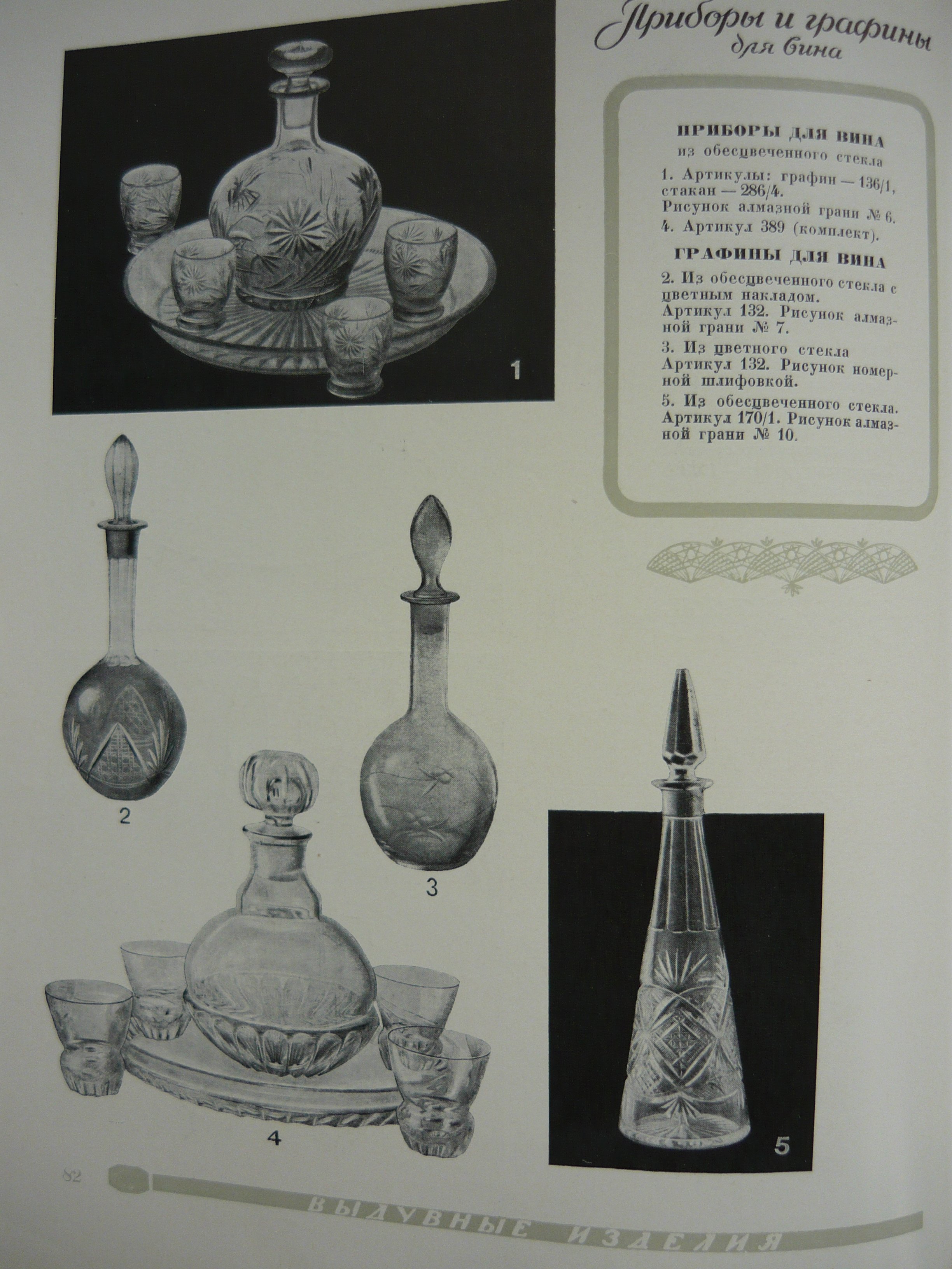 Лот 102. Графин для вина конусообразной формы из обесцвеченного стекла. Артикул 170/1, рисунок алмазной грани. Наверное, Гусевской хрустальный завод, 1950-е гг. Не могу сказать точно по производителю, может и Дятьково, и "Красный гигант " Пензенской обл. (бывший Бахметьевский). Подобный приводится в каталоге сортовой посуды за 1957 год (последний снимок ). Высота без пробки — 27 см, с пробкой — 35 см, диаметр основания 10 см. Объём 0,6л. Родная пробка, отличное состояние. Цена 1400 руб. ПРОДАН Sar13 -