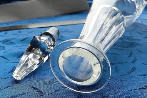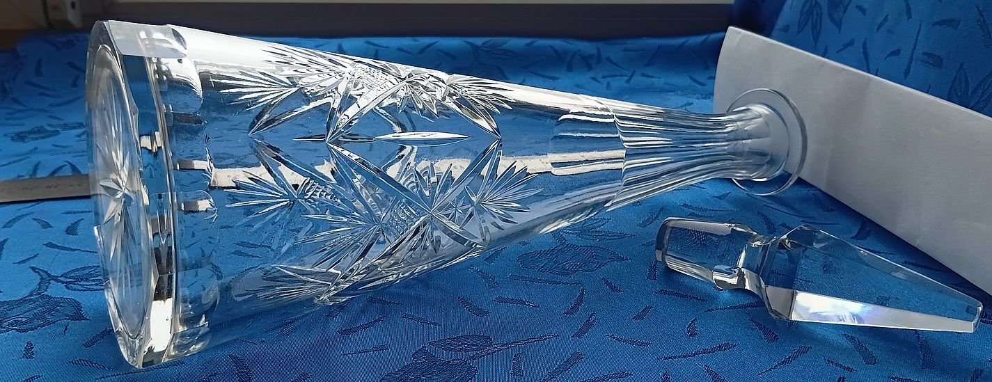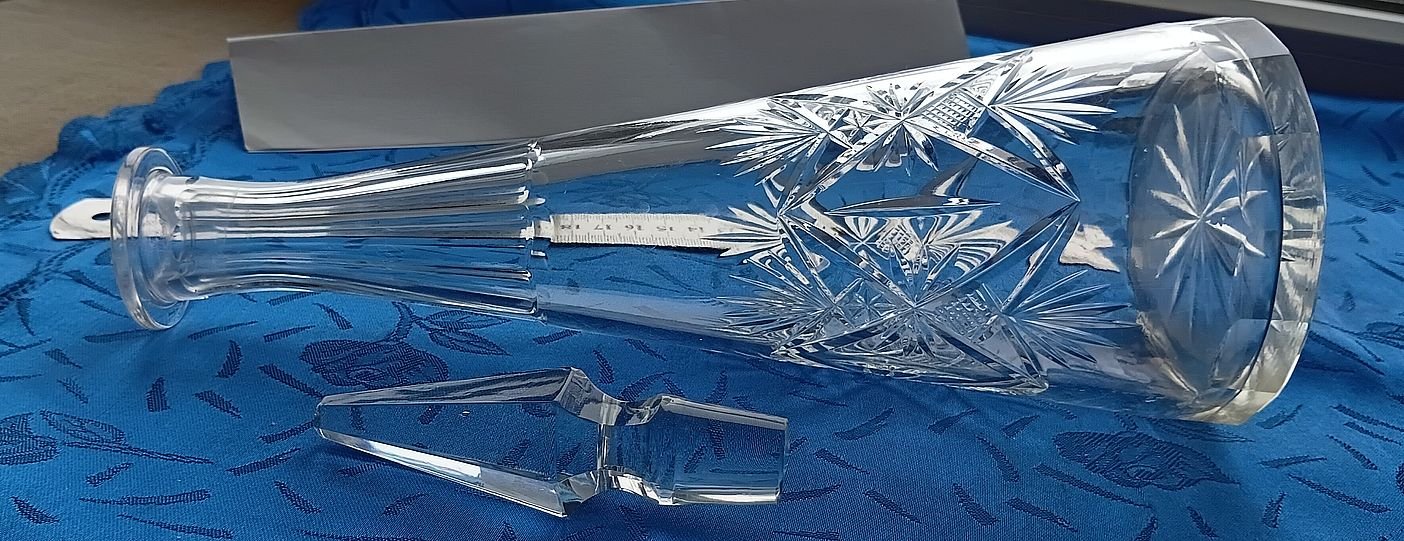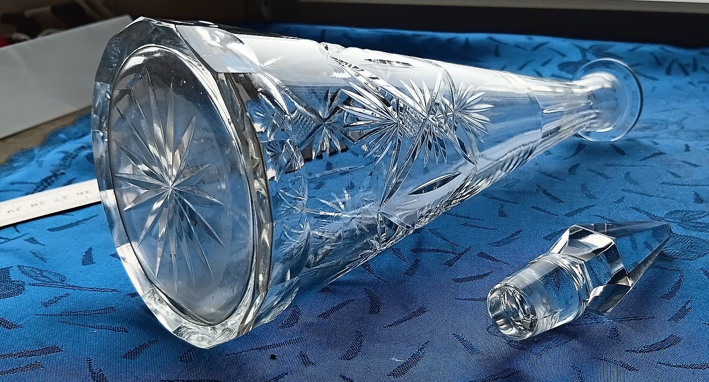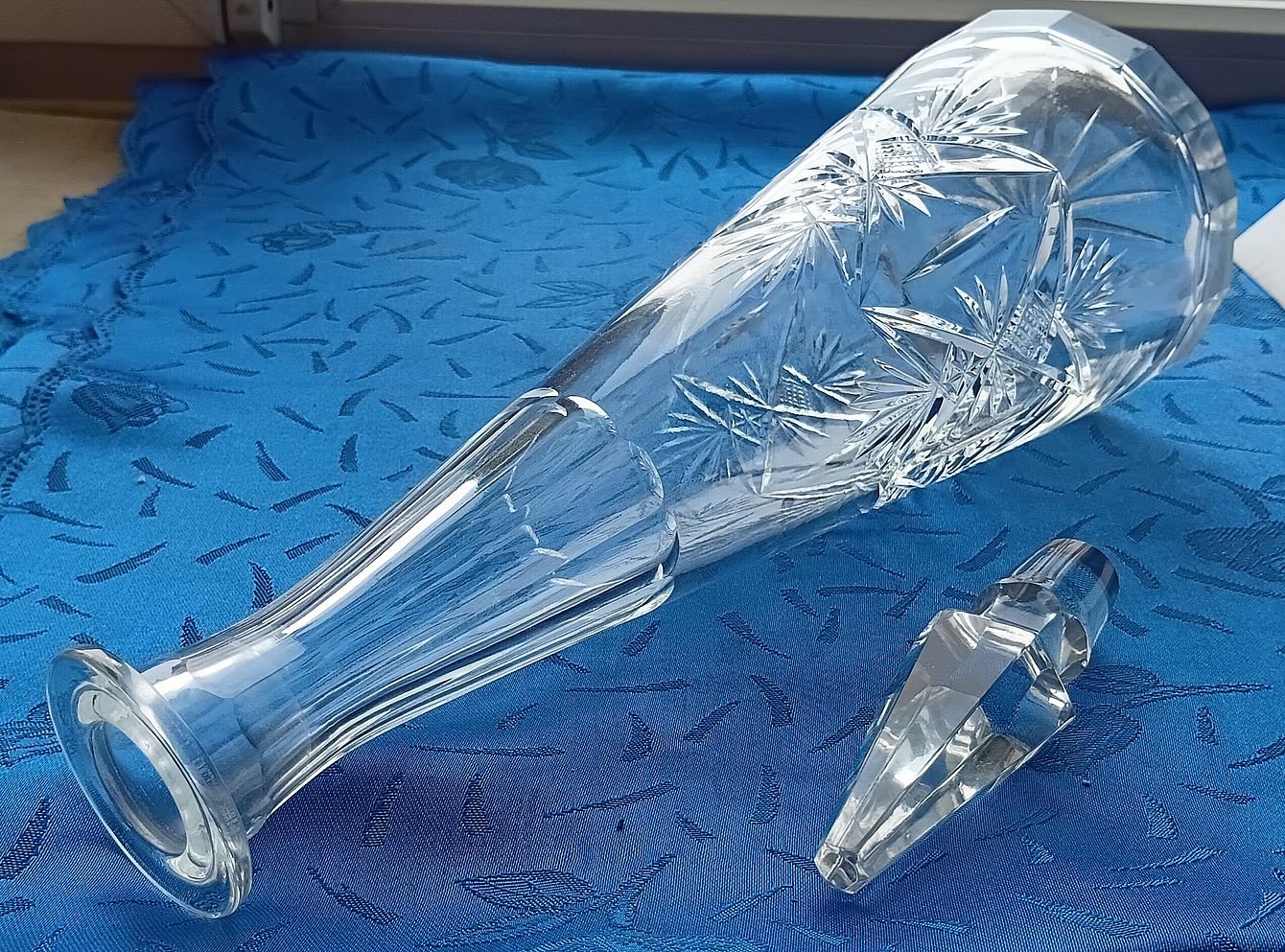 Лот 102. Графин для вина конусообразной формы из обесцвеченного стекла. Артикул 170/1, рисунок алмазной грани. Наверное, Гусевской хрустальный завод, 1950-е гг. Не могу сказать точно по производителю, может и Дятьково, и "Красный гигант " Пензенской обл. (бывший Бахметьевский). Подобный приводится в каталоге сортовой посуды за 1957 год (последний снимок ). Высота без пробки — 27 см, с пробкой — 35 см, диаметр основания 10 см. Объём 0,6л. Родная пробка, отличное состояние. Цена 1400 руб. ПРОДАН Sar13 -
