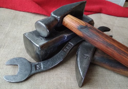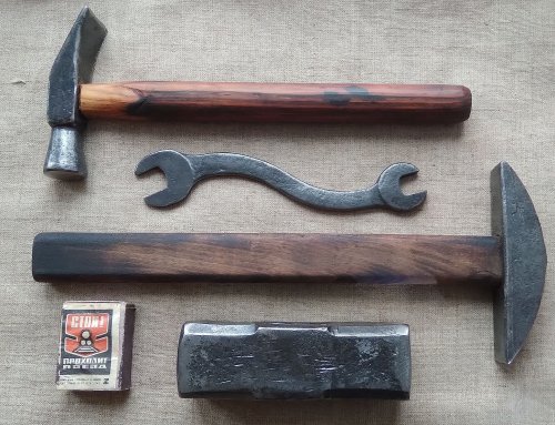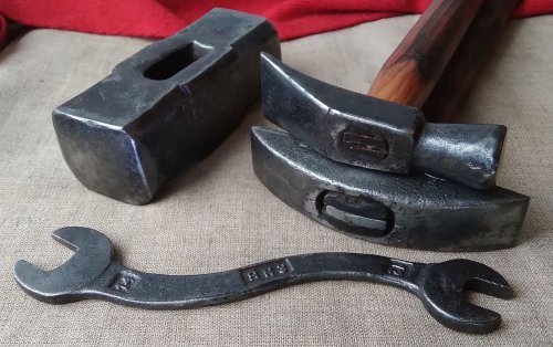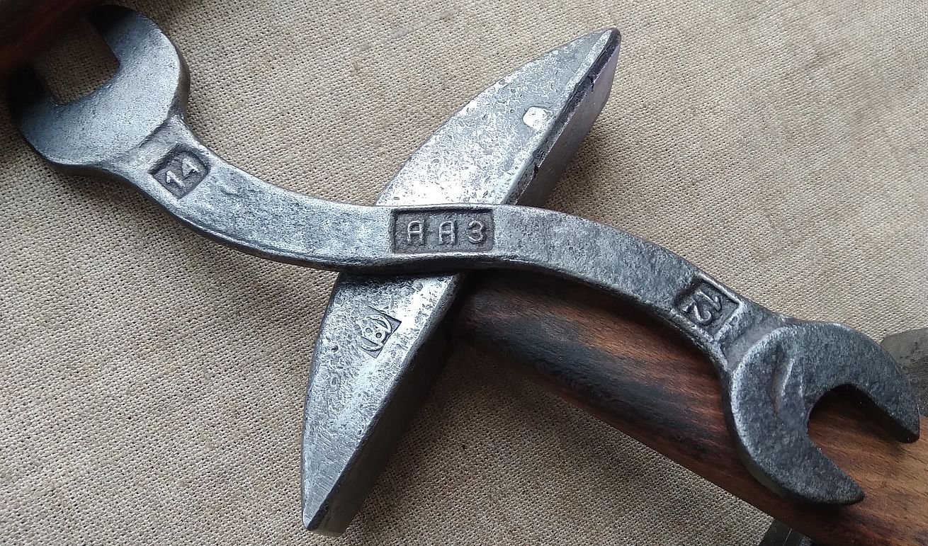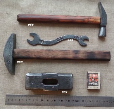 1. 958. - древний интересный молоток, вес в сборе 303 гр. - 460 руб. 959. - Kлюч гaeчный 14x12 poжковый ("змейка") клеймo "ААЗ" - Авто Агрегатный завод, Москва (филиал ЗиС, ЗиЛ). На некоторых торговых площадках пишут что: - "Входил в набор инструмента автомобилей периода BOB для автомобилей ЗИС и ГАЗ". Это неверно, потому как Автоагрегатным завод стал называться в 1948г. Конец 40-х - начало 50-х более верное время изготовления. - 260 р. 960. - молоток для отбивки кос, клеймо ЛСПО им. Я.М. Свердлова, Ленинград, вес в сборе 375гр - 340 руб. 961. - кувалда вес 1565 гр - 680 руб. Справляйтесь о наличии.