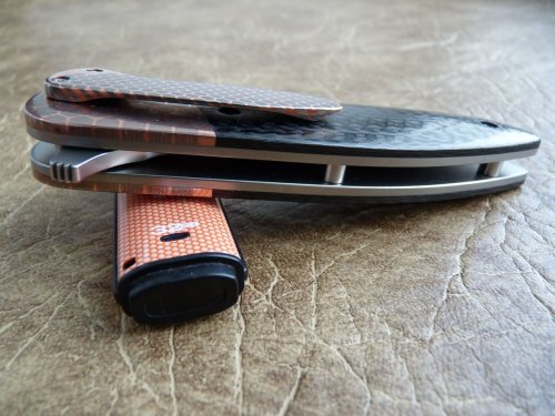 Давно приглядывался к работам Peter Carey но все как то не срасталось. То один ножик то другой отвлекали внимание от покупки. Да и гринд клинков вызывал двоякое чувство. С одной стороны хороши но в то же время что-то в них не то. Но скорей всего не созрел тогда еще. :D Но вот когда Peter начал делать флипперы особенно Nitro я понял надо брать :) И вот Nitro Flipper Superconductor :) Это маленькая версия Nitro с клинком 8см. Маленькая прелесть! :) Красив до не приличия! :( Качество и флипп отменный. В руке лежит очень удобно. Клипса правда очень жесткая, не отогнуть ее. Больстеры сделаны из меди. Очень красиво. И отменное сочетание меди и карбона. Говорят что со временем медь покроется благородной патиной. Это как хорошее вино с годами цена растет. B) Подозреваю что это нож из класса один в своем роде, т.е. второго такого нет :) Ну наслаждайтесь :) Фотки