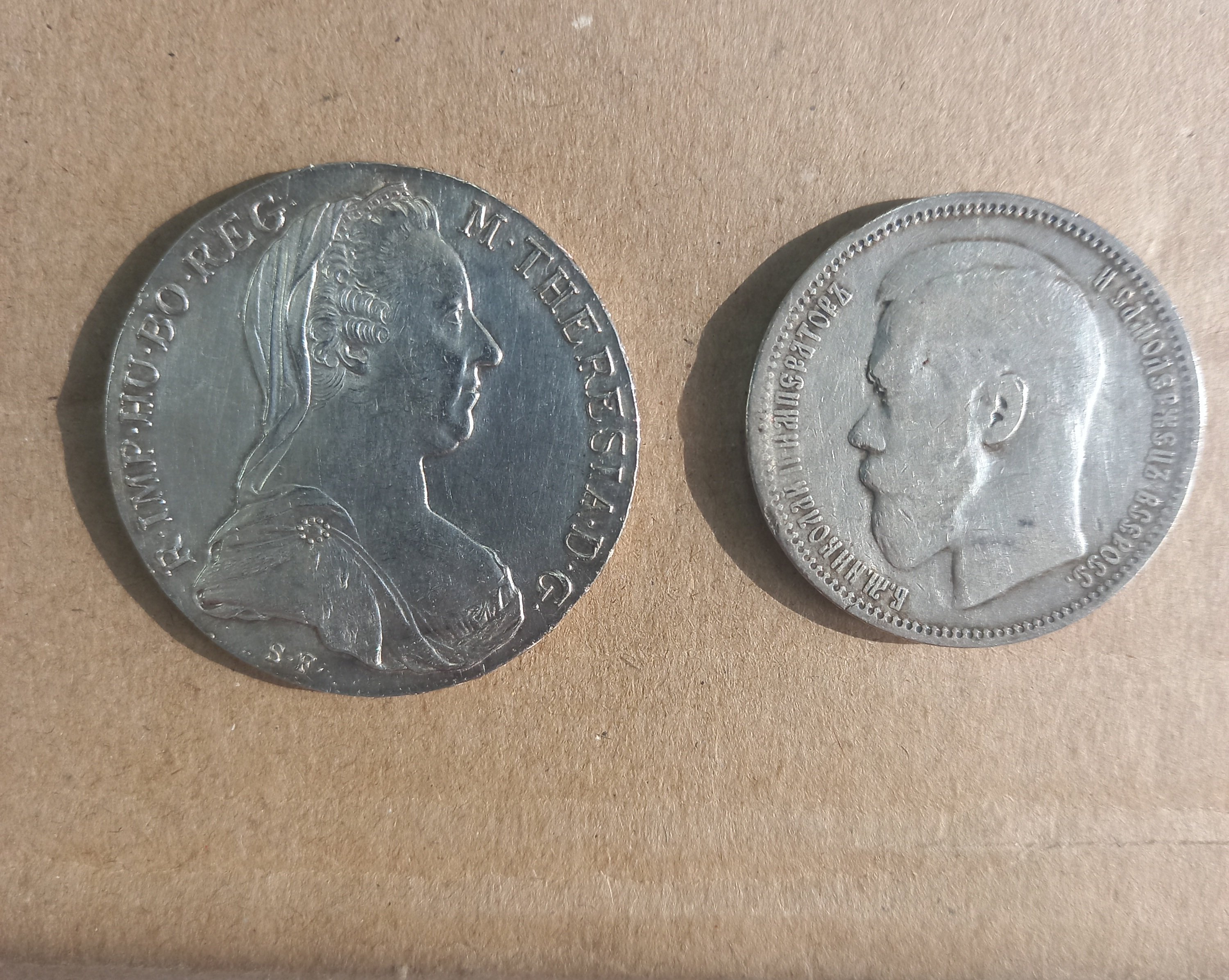 Продам. 1. Рубль Николай II, 1896 г. состояние неплохое Цена 4800 + почта 2. Талер Мария-Терезия рестрайк, состояние отличное вес 29,1 содержание серебра 0,833 Цена 4800 + почта