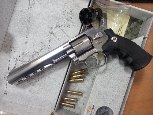 Продам Gletcher Smith&Wesson пулевой, 6", б/у рабочий Состояние нормальное, накладка рукояти немного болтается Комплектация как на фото: Коробка, "патрончики", приспособа для быстрого заряжания, и ещё что-то... Временно снят с продажи, как нерабочий