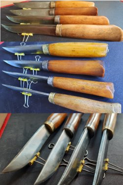 Ножи не точились, кое-где проглядывает поперечный сатин. Клейм не было. Возникает вопрос мог ли завод не клеймить бытовые ножи, например во время войны. Все-таки это трудозатраты, а народу и так стало меньше. В конце концов это не ХО, а бытовые ножи - картошку чистить. В России, например, бытовые ножи по закону клеймить не обязательно, есть только рекомендация. Как было в Финляндии-не знаю. Если это все же артельщики, то не очень понятно зачем с такой точностью копировать заводские ножи - качество то, практически не хуже, смысла не вижу. Если расположить маркированные ножи и не маркированные - никакой разницы, кроме наличия клейма - нет.