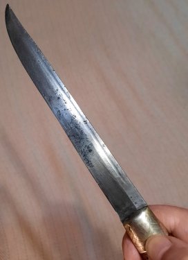 Работяга без затей. Думаю на WW2. Рисунок, судя по остаткам был очень простым, типа волнистых линий. Клинок 190 мм, толщина 4 мм. -