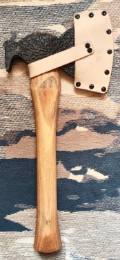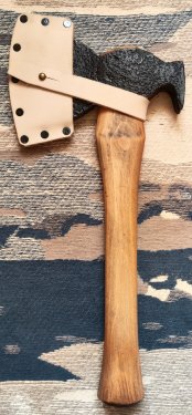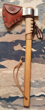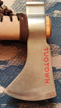 Топорик Tuotown, немного доработанный. В комплекте родная коробка, рукоять и чехол. Добавил чехол из натуральной кожи и сделал рукоять из ясеня длиной 50 см. Сделал несъёмным, но можно убрать защиту срезать намотку и будет сменная. В подарок карабин и темлячок с бусиной в виде черепка с перьями . 3500+ почта