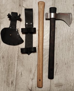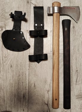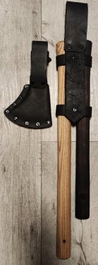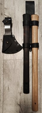 Голова 165 мм, р.к. 86 мм, вес головы 450 г. Голову переточил в линзу, сделал чехол и подвес для рукоятей из натуральной кожи, одна рукоять из ясеня длиной 50 см, вторая из бука длиной 41 см, плюс родная рукоять и чехол не пользованые. Родная коробка в комплекте. Делал для себя, но жена подарила такой же. Цена за все на фото 4000 плюс почта
