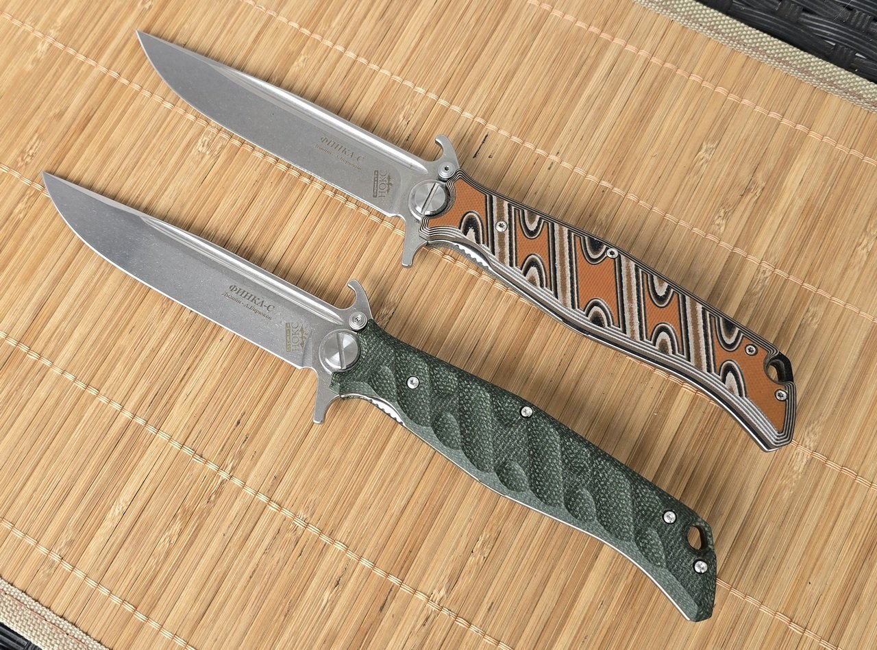 НОКС Финка-С в новом исполнении. На рукоятке - микарта, на клинке - VG-10. На шайбах. В сравнении со старой: G-10, D2. Чуть полегче стала, грамм на 20.