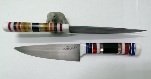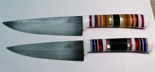 Всем доброго дня. Поделал средние кухонники, такие ножи мужики дарят своим женщинам. Клинок 140х36х3 мм и 150х36х3 мм. Быстрорежущая сталь. Ножи от фуганка. Оптимальная закалка. Ручки наборные акрил, эбонит.- 313 ответов