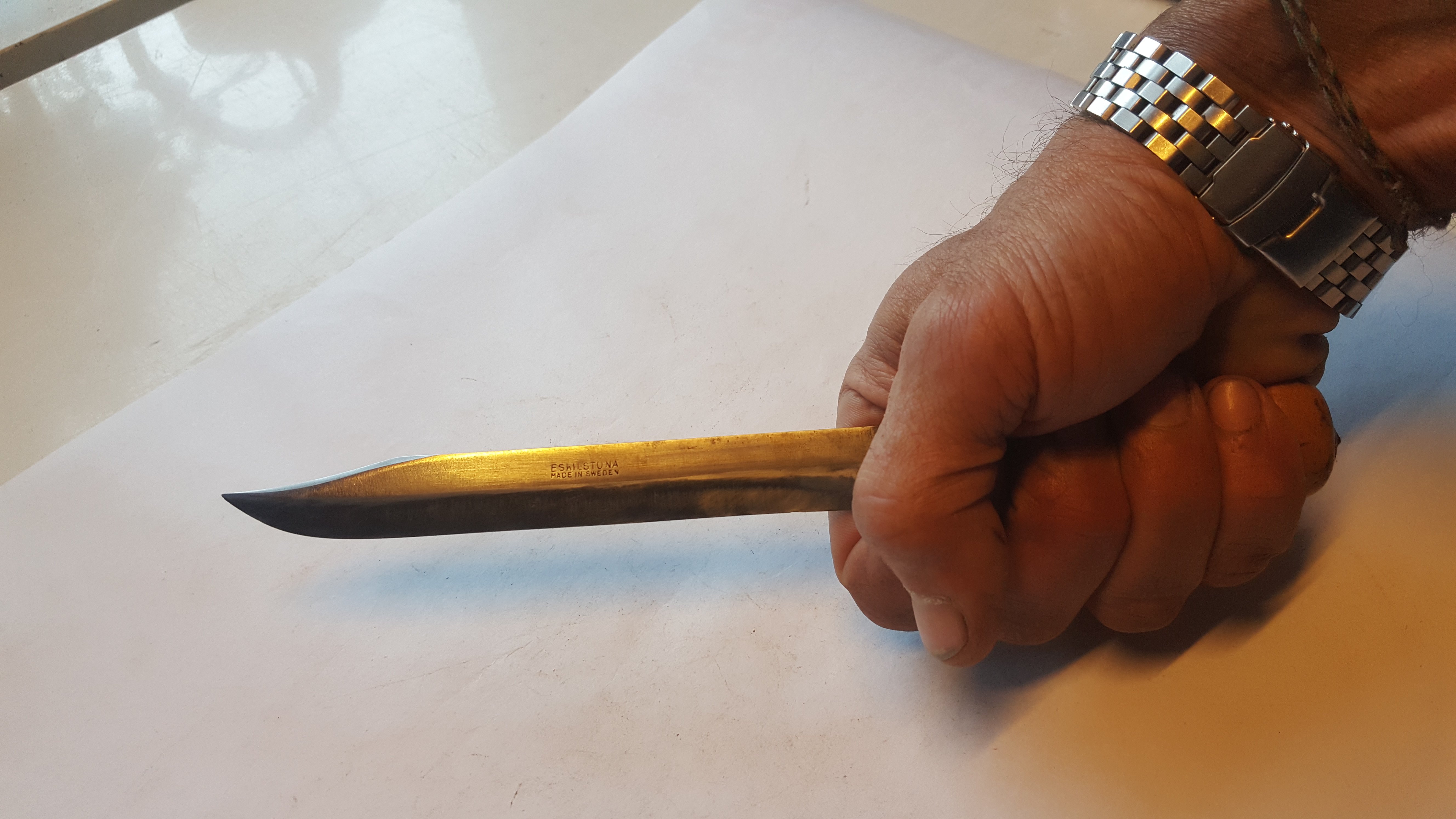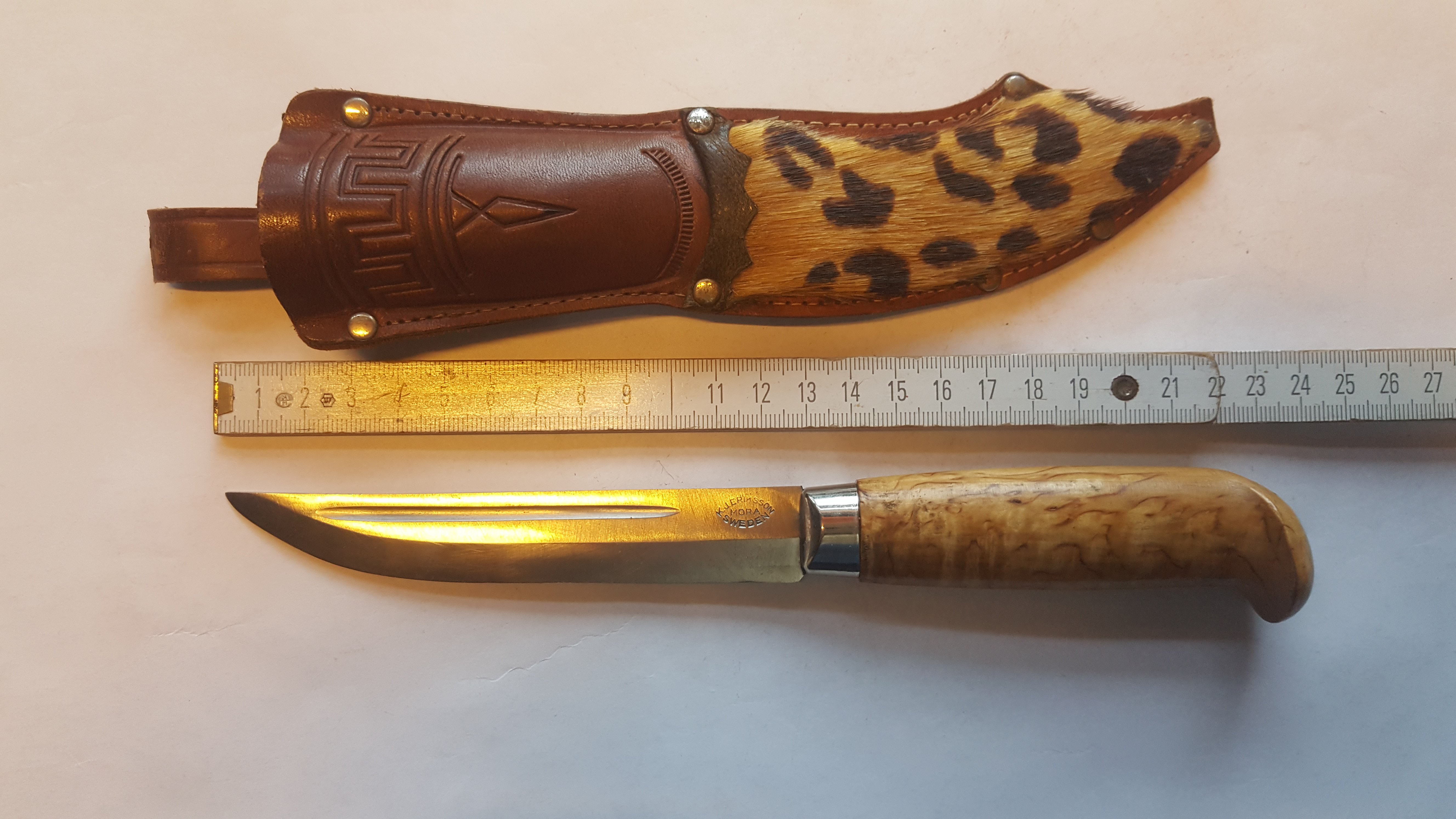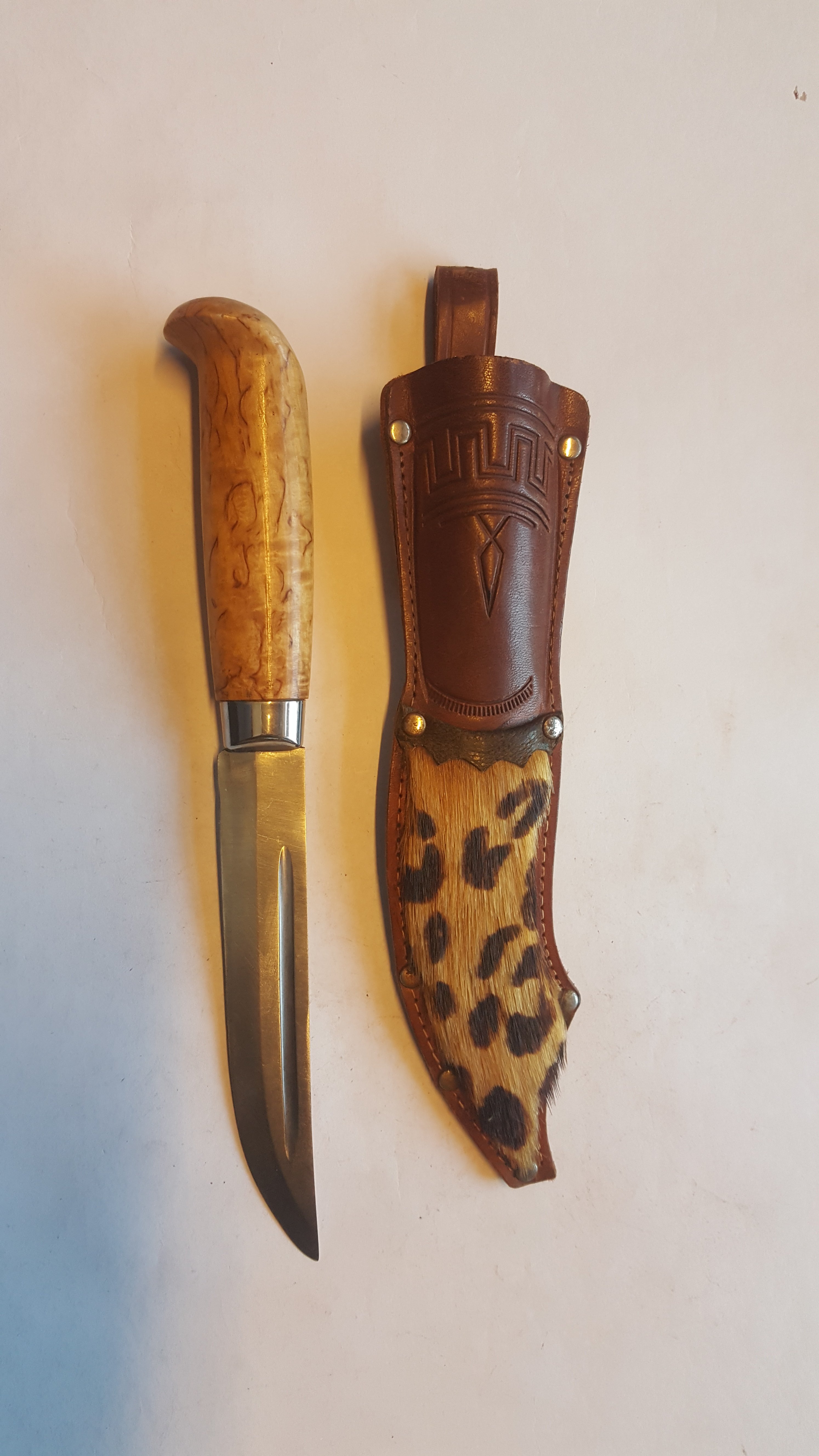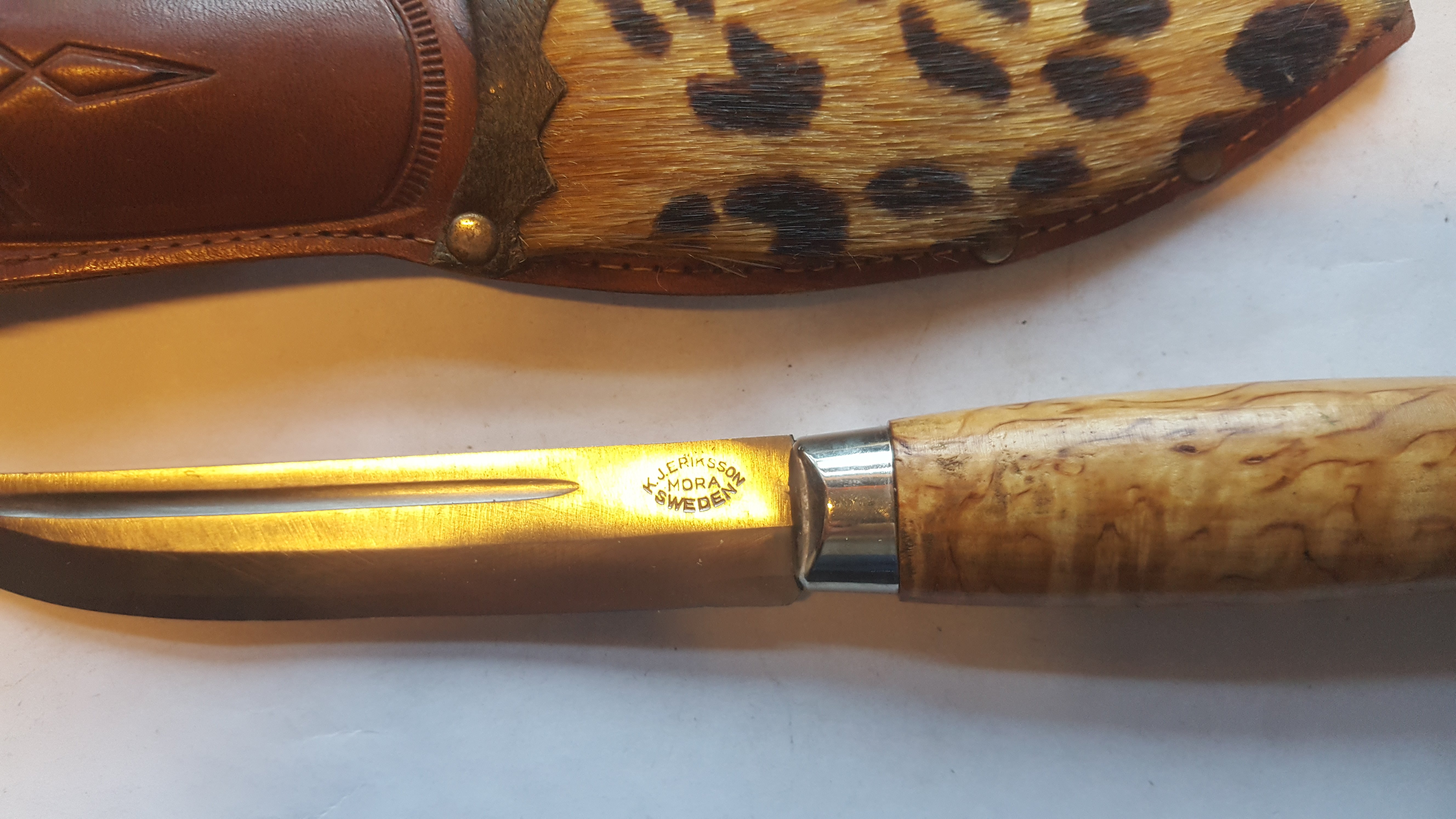 2- от C. Andersson читай moCAra. Клин ламинат 5см , толщина у оковки 2.5 мм. На обухе фальшзаточка. Монтаж на стяжку. Чехол украшен гербом города Мора и надпись Falun ( поискал в сети , нашёл населённый пункт с таким именем. Может приурочено к ножевой выставке- не знаю. Подвес свободный и на пуговицу. Вообщем сделан по взрослому.