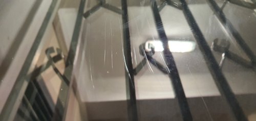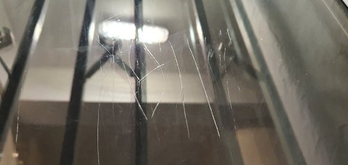 Тема, казалось, себя уже исчерпала и я даже всех поблагодарил за участие, но вот решил вечером в укромном месте подъезда попортить стекла и проверить твердость клинков. Не могу не поделиться интересными результатами... Фото ниже - результат работы по стеклу ножом моей супруги. Напомню, сталь - кованая Х12МФ. А теперь ниже 2 фото моего Elmax, причем в каждое фото - это отдельная попытка что-то изобразить в разных местах стекла. Широкие белесые полосы на первом фото ниже - это не дефект фотографирования борозд, это плоские следы, как если бы я мылом по стеклу мазнул. Скажу честно, я старался -