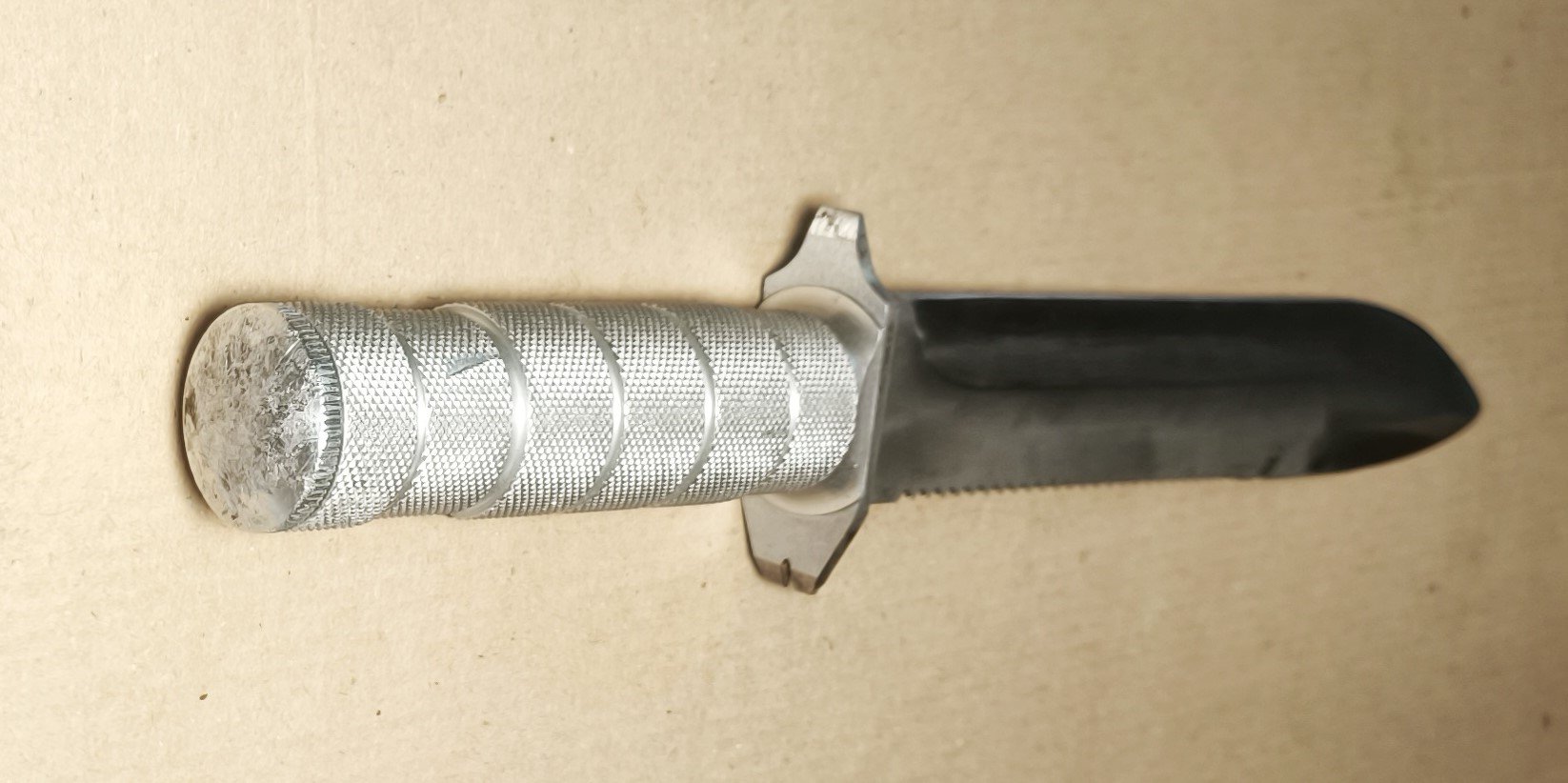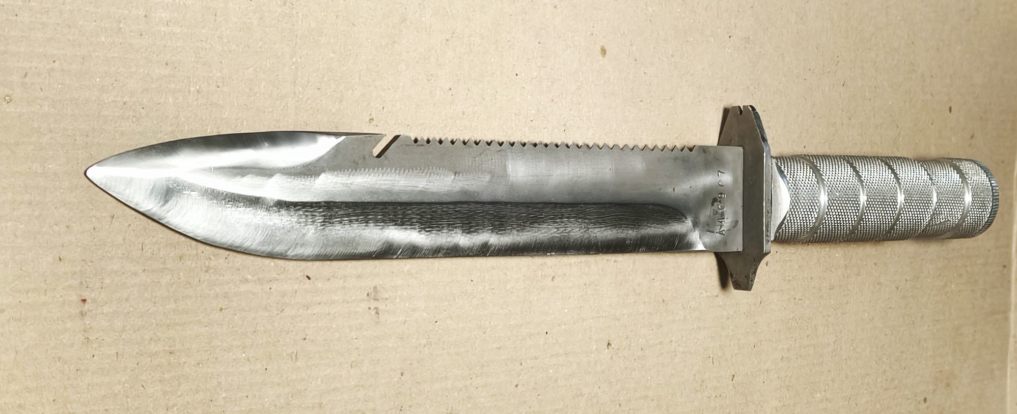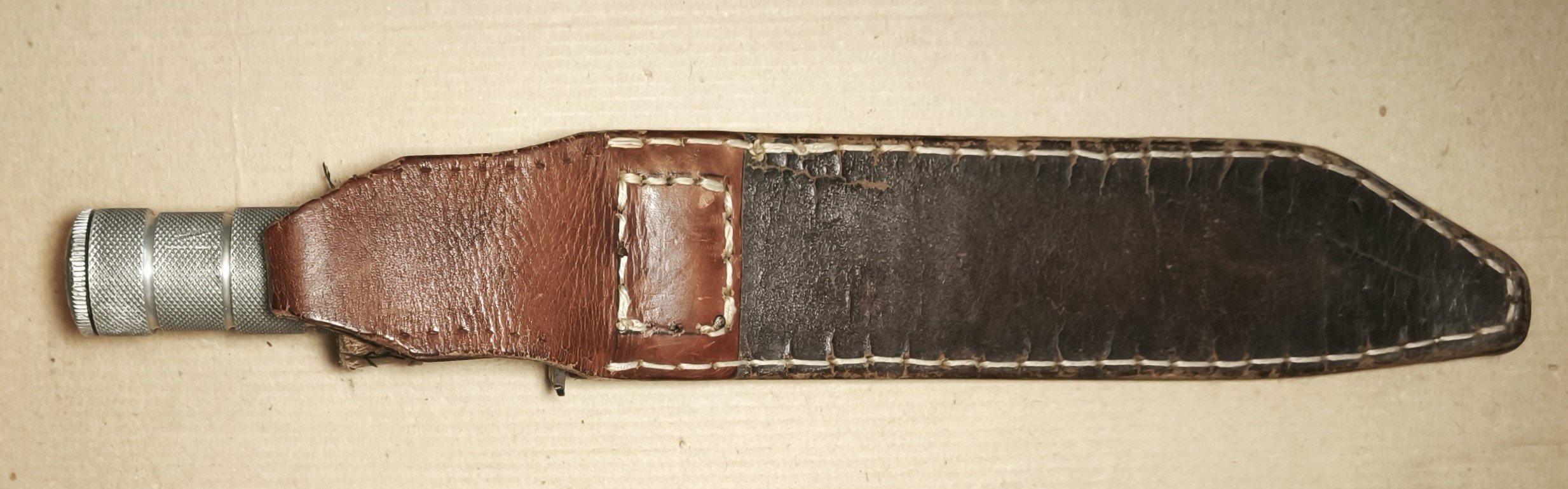 8 октября 2023 года в этой теме показал подарочный, весь полированный "Аспид". А недавно получил нож, реально участвовавший в Чеченской кампании. Острие пострадало, заточено под менее острым углом. Ножны самодельные, того времени.