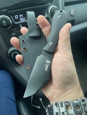 Получил вчера в подарок вот такой вот CJRB. - Сталь AR-RPM9 в PVD, на Caldera эта сталь в этом покрытии показала себя хорошо, так что уже ожидаю от ножа позитива. - Рукоять из FRN довольно тонкая, со стальными вставками. Клипсу к ней прикрутили максимально толерантную, нож в кармане вообще незаметен. - Клинок - Варнклиф, причем весьма удачный на мой взгляд варн, РК находится ниже рукояти и ничто не мешает ножу при резе. Толщина клинка небольшая - всего 2,5мм и при прямых спусках практически от обуха получается весьма резучая форма. - Замок - баттонлок, удобный и четкий. Сухие цифры: Длина клинка - 85мм. Общая длина - 193 мм. Вес - 80 гр. Я так понимаю, не надо долго думать, чтоб понять - на какой именно нож смотрели Артизаны, когда рисовали свой «универсальный EDC на каждый день». По факту да, таким он и получился - легкий, тонкий, незаметный на кармане, резучий и довольно удобный. Пока ощущения от ножа положительные, а дальше - будем посмотреть.
