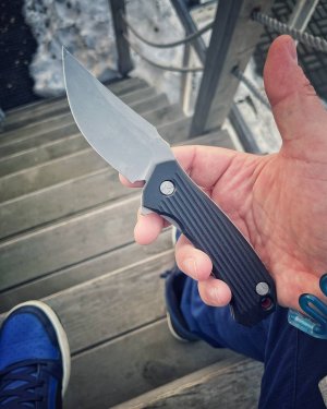 Итак… Крайт осел на кармане очень плотно. С Тезисом и так всё было сразу понятно, заочная любовь по фото - «Мой любимый цвет, мой любимый размер», а вот Крайт надо было пробовать. Удачное соотношение массивной рукояти и относительно короткого, но широкого клинка, при этом имеющего довольно тонкий и узкий кончик. Люблю такое соотношение - ножом удобно управлять и усилие хорошо передается с рукояти на клинок. Рукоять у ножа сама по себе довольно толстая, но продольные насечки создают ощущение дополнительного объема. Я люблю рукояти, которые хорошо заполняют ладонь и это как раз тот самый случай, ну, с учетом того, что у меня ладонь максимально средних размеров. Понятно, что для того же Алексея Инферниса эта рукоять будет мелковата. Клинок довольно универсальный - как я написал выше, он широкий и при этом имеет довольно узкий и тонкий кончик, спуски у него прямые и довольно высокие. В итоге он умеет хорошо и резать, и прокалывать, ножом удобно оперировать и потягом, и пушем. В общем, мне нож понравился, а погрызенное бобром основание клинка - нууу… оно есть )))), довольно быстро перестал его замечать. ЗЫ: И да, есть какое-то ощущение монолитности всей конструкции.