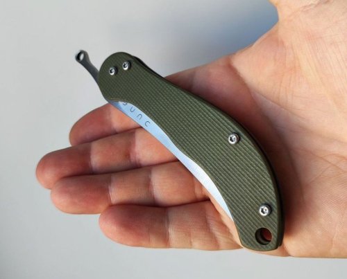 Дюна их приглянулась, но как-то увидел уже тогда, когда это уже стало неактуальным. Видел видео от автора, он сказал, что хотел сделать что-то типа перса. Когда искал хоть что-то о ноже, наткнулся только на видео от автора и на гневный отзыв от пользователя, пишущего, что нож сделан .... плоховато ))) Не знаю так ли оно, не пробовал, но торчащие головки винтов настораживают.