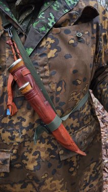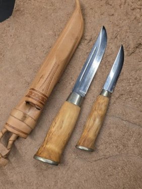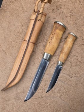 Ну вот... Приехал. Первые впечатления - несмотря на некоторую изящность по сравнению с остальными моими леуку, довольно увесистый. Ручка рассчитана под голую руку, надо привыкать. В целом очень понравился. Заворонил лезвие для защиты от коррозии и что б органично смотрелся со своим младшим. Получилась вот такая очаровательная пара!