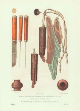 Вот и у меня в том же направлен ножницы, советскиеии мысли движутся. Надысь нарыл на даче старыеножницы, советсткие ещё. Резать уже ничего не могут, а просто выбросить рука не поднимается. Решено - делаю два ножа в аборигенском стиле. Один - с полностью деревянными ножнами, а второй наверное сделаю или с берестяными, или с металлическими в нганасанском стиле. Типа таких (фото взяты из какой-то этнографической статьи): -