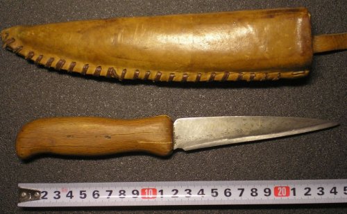 Ух ты! Это значит у меня прямо реконструкция ножа домонгольского периода есть! :) Р6М5, бук. Ножны деревянные, изнутри оклеены тонкой замшей, чтобы нож не гремел и сидел плотнее. Снаружи оклеены свиной кожей 1,5 мм. Подвес "а ля печак", прикреплён к "чехлу" из свиной кожи. В своё время, ножик прошёл пару колымских экспедиций и одно "бытование" на Русском Севере, во время которого его дважды пытались скомуниздить ненецкие аборигены. Что говорит о качестве и удобстве конструкции. Потом девайс долго юзался на даче в качестве любимого рабочего ножа моего шурина. Сейчас шурин безуспешно добивает древнего Эрика (а вот хрен его добьёшь!). Этому же ножу я полечил рукоять (на фото видны расчищенные трещины) и убрал до времени. Сам поработаю им что ли... -