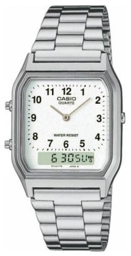 Мои тоже с Касио начинали. Младший - с "Винтажа" цифро-аналогового. Сами часы уже не найду, поэтому честно стырил картинку в и-нете: Конструктив прочный, корпус небольшой, браслет регулируется под детское запястье без изъятия звеньев - удобно. Ну и основное - легко научиться стрелочным циферблатом пользоваться, подсазка-то всегда рядом. Сейчас только стрелочные пользует - от Жи-шоков до Ориентовской механики. А старший крупным уродился, ему сразу "взрослый" Иллюминатор подошёл. Потом приличные Едифайсы ему дарил - проносил с год, и положил на полку. Сейчас только фитнес-браслет таскает, даже от эппл-вотчей отказался, говорит, в смартфоне всё есть...