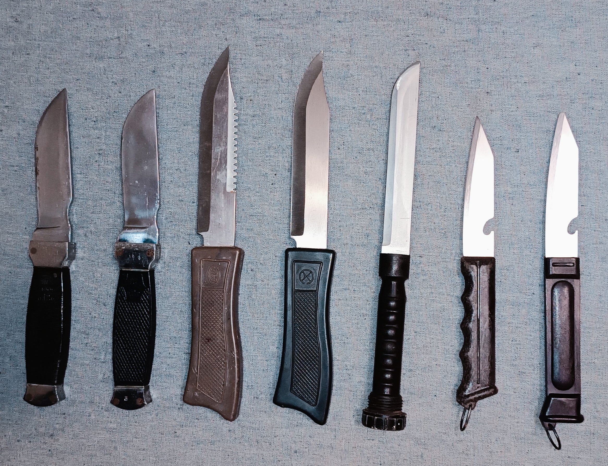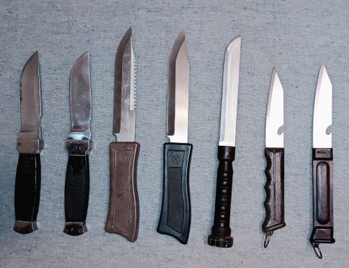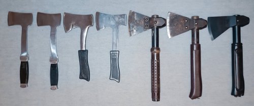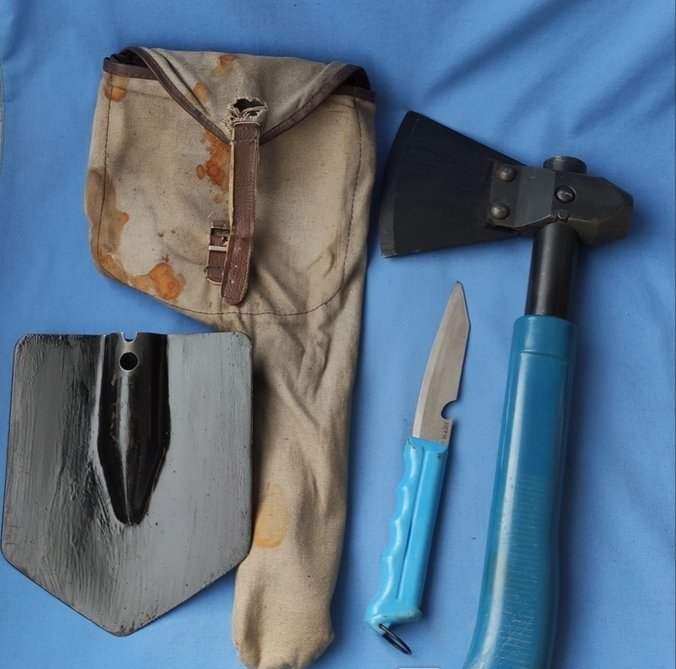 Ножи и топоры с наборов (НОП, НОТ, НОР) периода СССР. А также, Набор охотника и рыболова, 2-й вариант, с рукоятью голубого цвета (фото с инета).