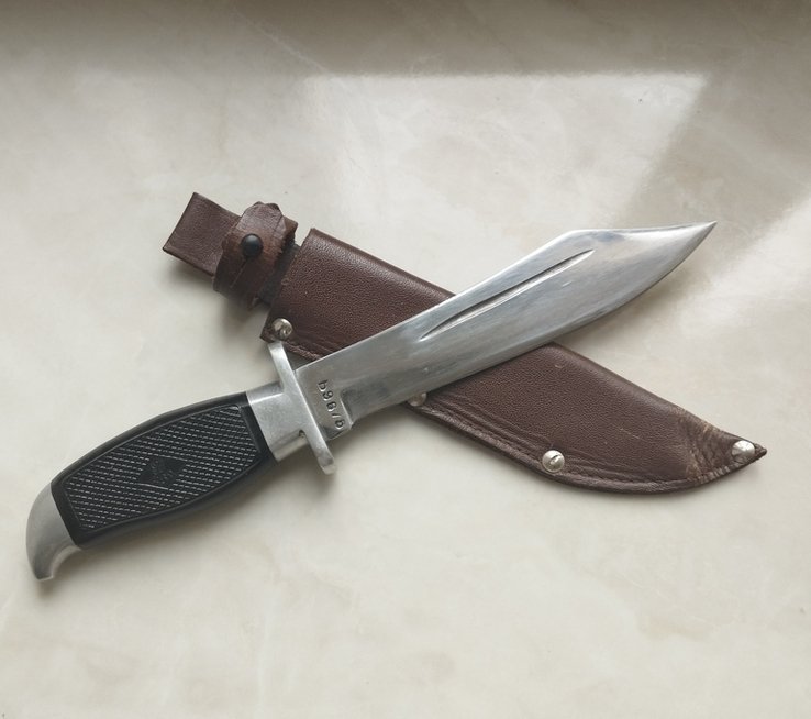 Купил нож из комплекта "Устройства металлического переплетного УМП-1" производства Рязанского завода автомобильной аппаратуры, периода СССР. Длина ножа 230 мм, длина лезвия 125 мм, толщина лезвия- 2мм, вес 128 гр, рукоять бакелитовая. Фото коробки и переплетного устройства из инета. На лезвии присутствует "09" или "60", а также логотип "Д" в двух полукруглах. Подскажите принадлежность логотипа?