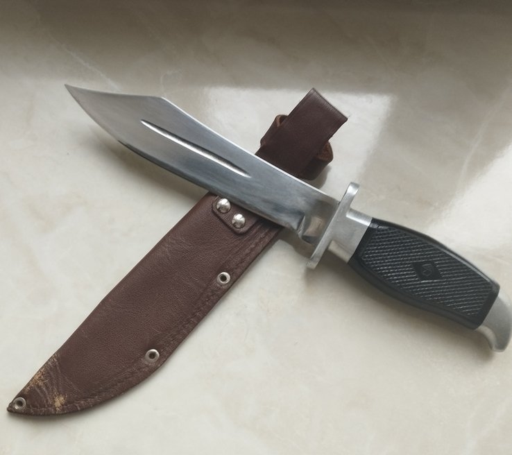 Общая длина ножа (как и топорика) 27 см, длина лезвия-15 см, толщина лезвия- 2 мм, ширина 2,7 см. Вес ножа -190 гр, топорика -685 гр. Очевидно, что при создании набора для ножа и топорика была взяли за основу одна ручка. Причем она должна была быть небольшая для компактности. Нож наверное более туристический -хозяйственно - бытовой чем охотничий. Рукоять на протяжении времени, когда изготавливали нож не модифицировалась. При этом ХСЗ параллельно выпускал отдельно Топорик туристский - там рукоять модифицировали.