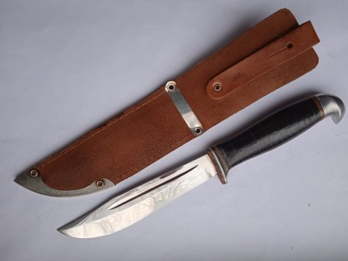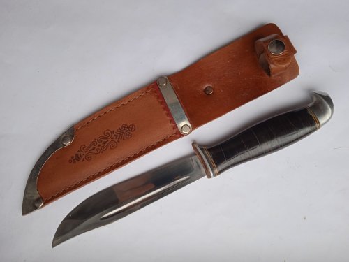 предлагаю большой финский нож модели "скаут" изготовлен в Каухаве, в 60-70-х годах прошлого века в пользовании не был, домашнее хранение клинок нержа рукоять кожа под лаком, гарда и грибок дюралевые, на расклëп ножны кожаные, без вкладыша общая длина без ножен 270 мм длина клинка от острия до гарды 145 мм ширина клинка 30 мм (макс) и 20 мм (мин) толщина клинка 3 мм 30000 ₽ пишите в личку или на bonarts@mail.ru