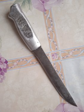 клинок и рукоять - от разных ножей... рукоять от старого "скаута", который изначально был с крестовиной. клинок от "номер 3", переделанный.