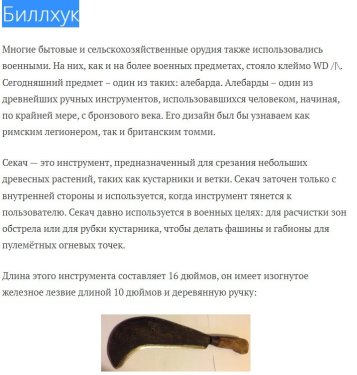 Billhook - иллюстрация с типичными формами и привязкой к графствам (журнал Countryman, 1982 г., автор Jack Wilson). Приказ № 1015 от 13.07.1915 г. о приеме Billhook на вооружение (обеспечение) британской армии. Как я понимаю - это первый официальный документ о приёме в войска. Ещё о Billhook. Статья hatchfive.wordpress.com. Кстати, есть целый сайт об этих изделиях - Billhooks.co.uk