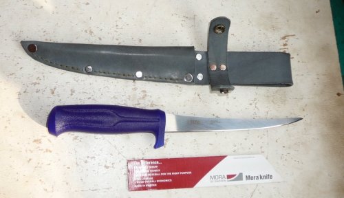 Нож 3. Нож Morakniv Filleting 5" flexible Редкий коллекционный моровский филейник Morakniv Filleting 5" flexible . Видимо, переходная партия: Такое клеймо начали ставить в 2015 г. Обозначение 549 на клинке встречалось у фростовского филейника Narrow Fillet Basic 549 Frosts Mora . А такую форму кончика клинка имеет современный 155-й филейник Fishing Comfort Fillet 155 Mora. Нож с правильным строем клинка - двойной клин от от гарды к острию и от обуха к РК. Нож Mora Filleting предназначен для разделки рыбы на филе. Нож Mora имеет удобную пластиковую рукоятку с гардой для защиты от попадания пальцев на лезвие. Клинок изготовлен из холоднокатаной нержавеющей стали SANDVIK. характеристики: Общая длина ножа 267 мм; длина клинка - 156 мм.; ширина клинка - 20 мм.; толщина клинка - 2 мм.; строй клинка - двойной клин : от 2 мм у рукоятки до 0,5 мм у кончика, от 2 мм по обуху до 0,4 мм у РК, подводы высотой 0,9 мм; сталь нержавеющая Sandvik (56-58 HRC); рукоять - пластик; ножны - кожа , авторские , Hand Made; вес ножа без ножен 68 гр. , в ножнах 105 гр.; производитель: Mora, Швеция. Нож оснащен тонким, гибким и узким клинком, который хорошо справляется с разделкой и филеровкой свежей рыбы. Материал клинка - высококачественная нержавеющая сталь Sandvik 12C27, закаленная жидким азотом при температуре - 80 °C. Этот вид стали в течение длительного времени удерживает остроту, характеризуется высокой коррозионной стойкостью, твердостью и прочностью. Материал рукояти - прочный ABS-пластик ярко-синего цвета, который не впитывает влагу и посторонние запахи, проявляет устойчивость к истиранию, ударам и механических повреждениям. Рукоять с развитым упором и шероховатой поверхностью уверенно располагается в руке. Ножны авторские, Hand Made. Кожа, склейка, прошивка, хольнитены. Застежка , фиксирующая рукоятку- курточная кнопка-кольцо. Обработка кремом Salamander prof. на основе натурального пчелиного воска, силиконового масла и активной формулы с фтором. Цена 4500 р. Пересыл на Покупателе. -