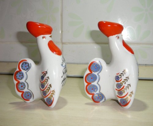 Фарфоровые солонка и перечница «Петушки» Полонский завод художественной керамики, УССР, 1984 г. Надпись на солонке: «Без соли и хлеба- половина обеда» Ялта 1984 г. Надпись на перечнице: «Перец есть – хозяйке честь» Ялта 1984 г. Продаются одним лотом за 600 р Пересыл под ответственность Покупателя и за его счет. -