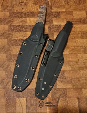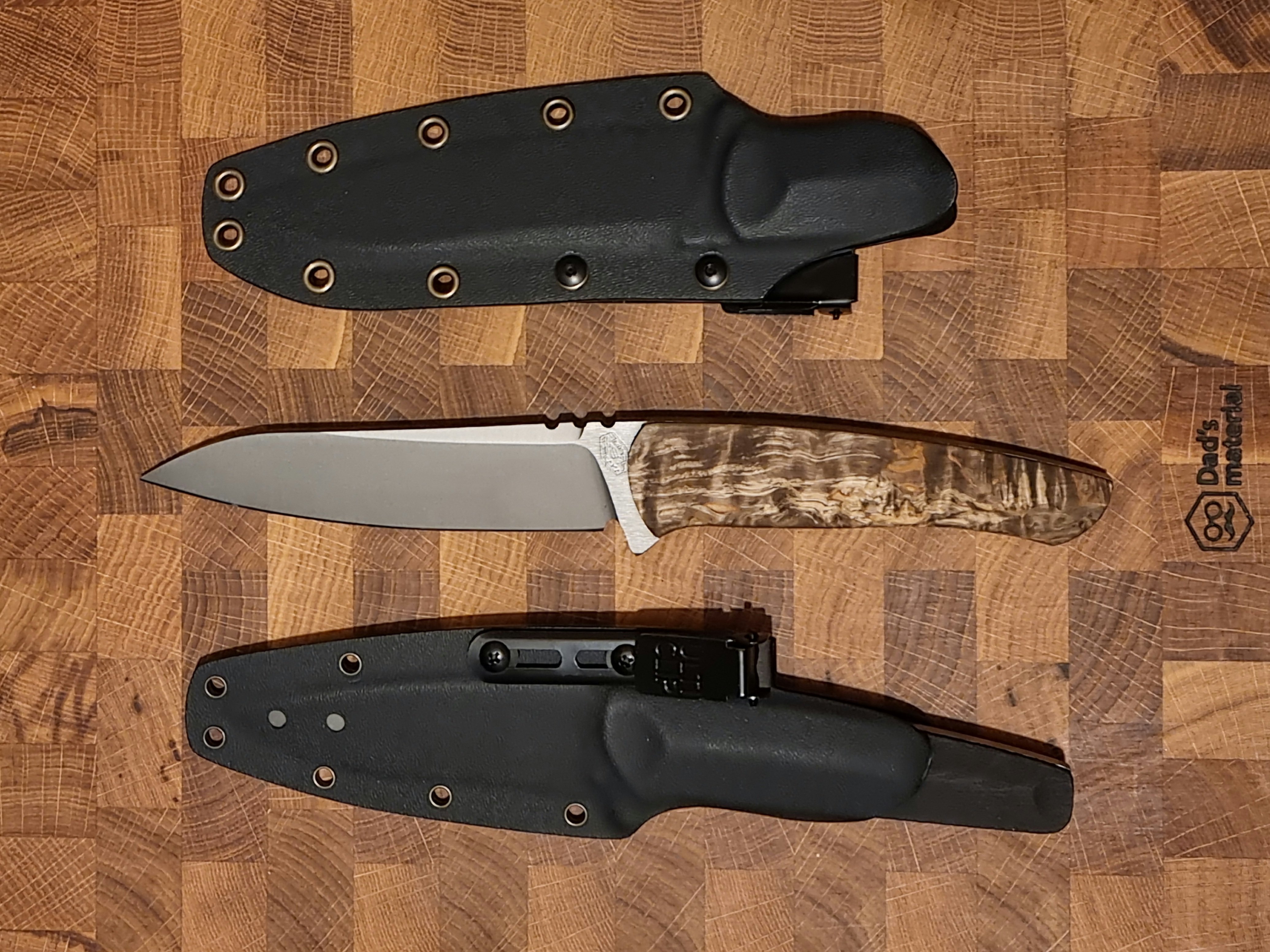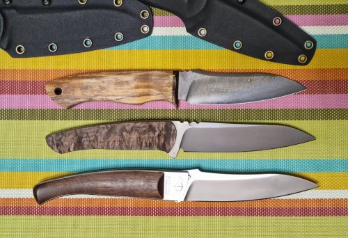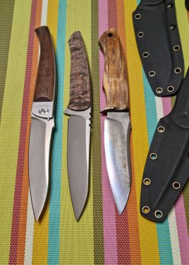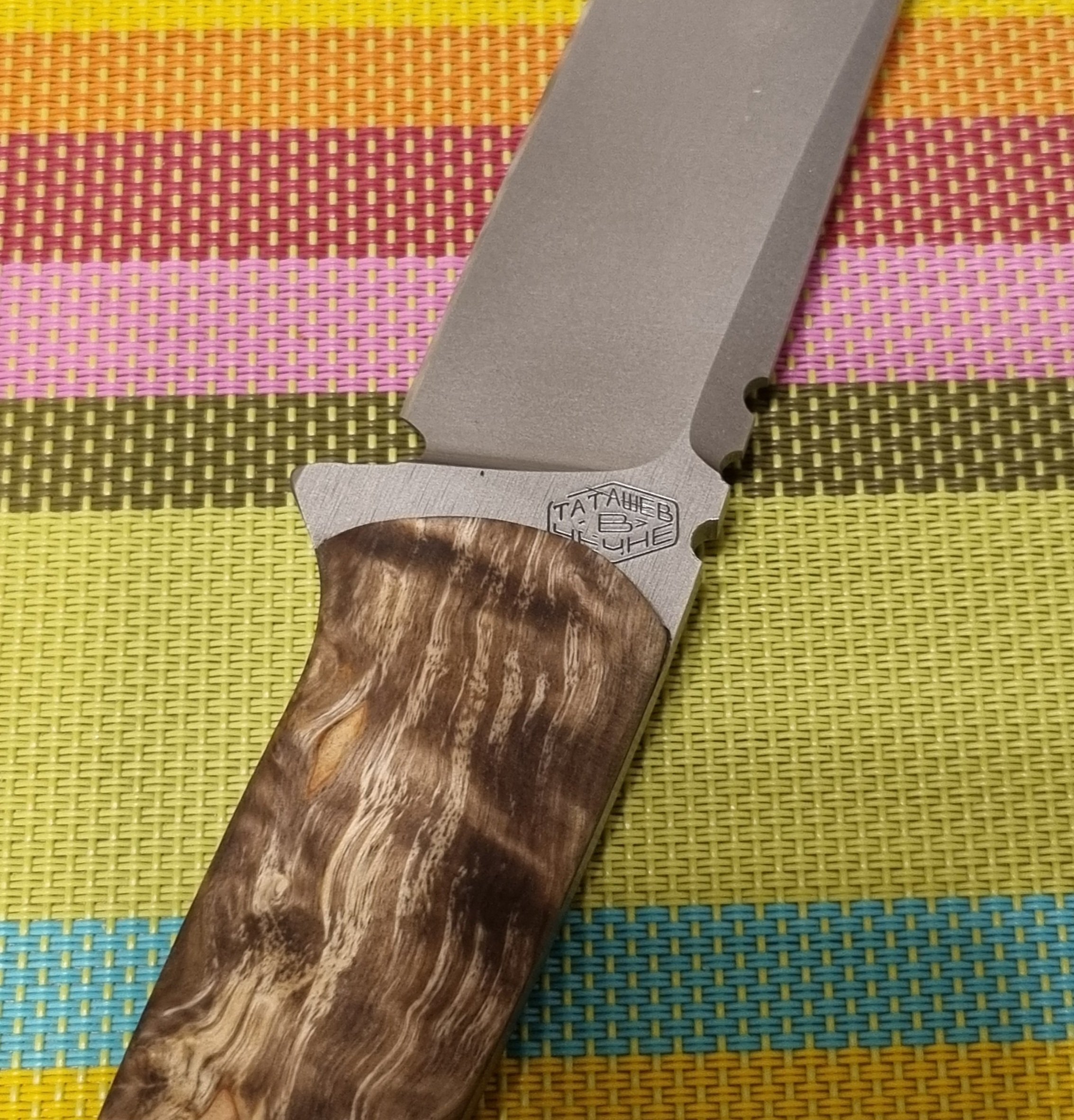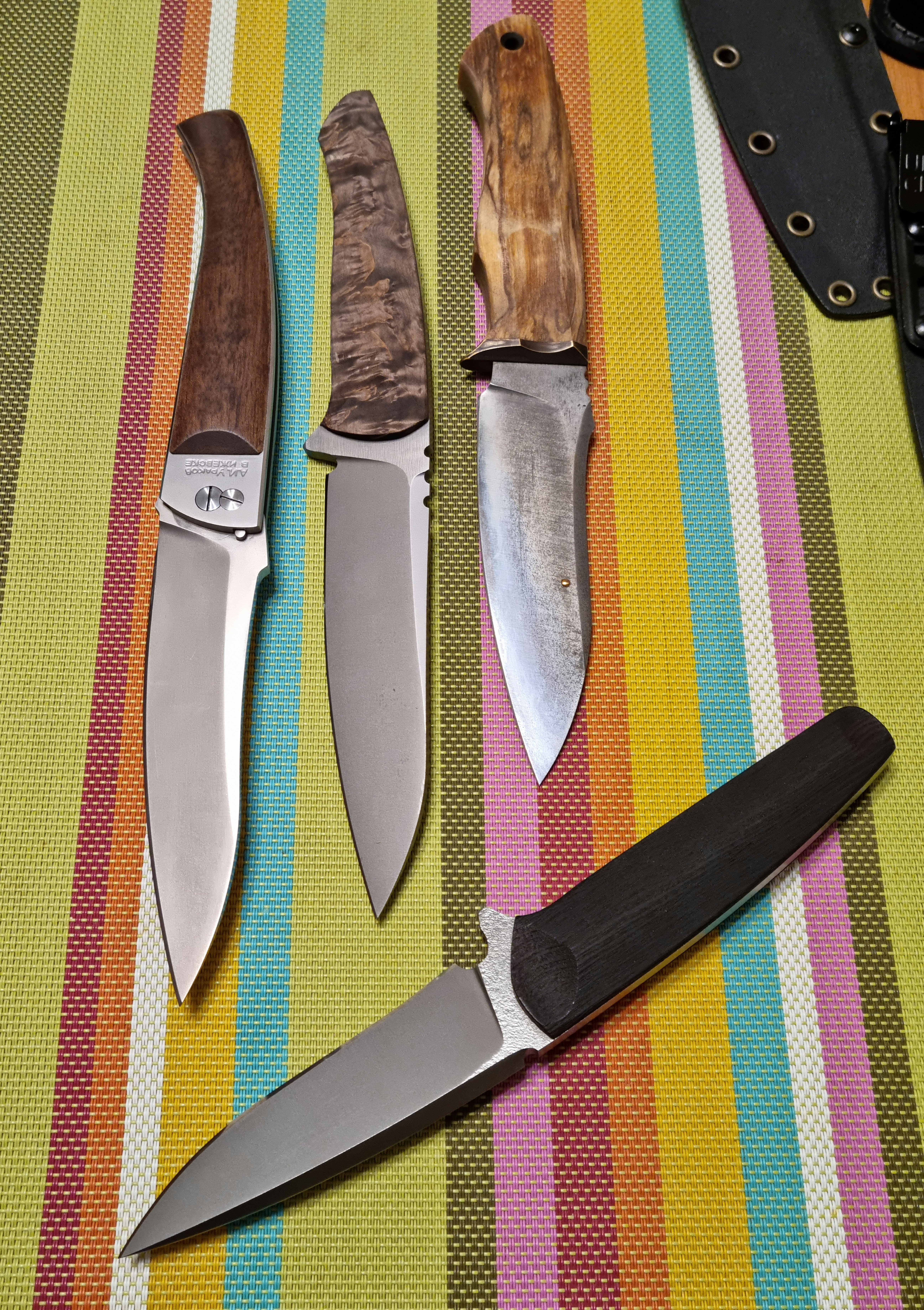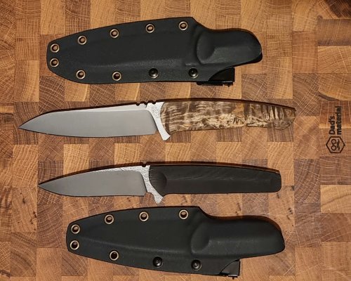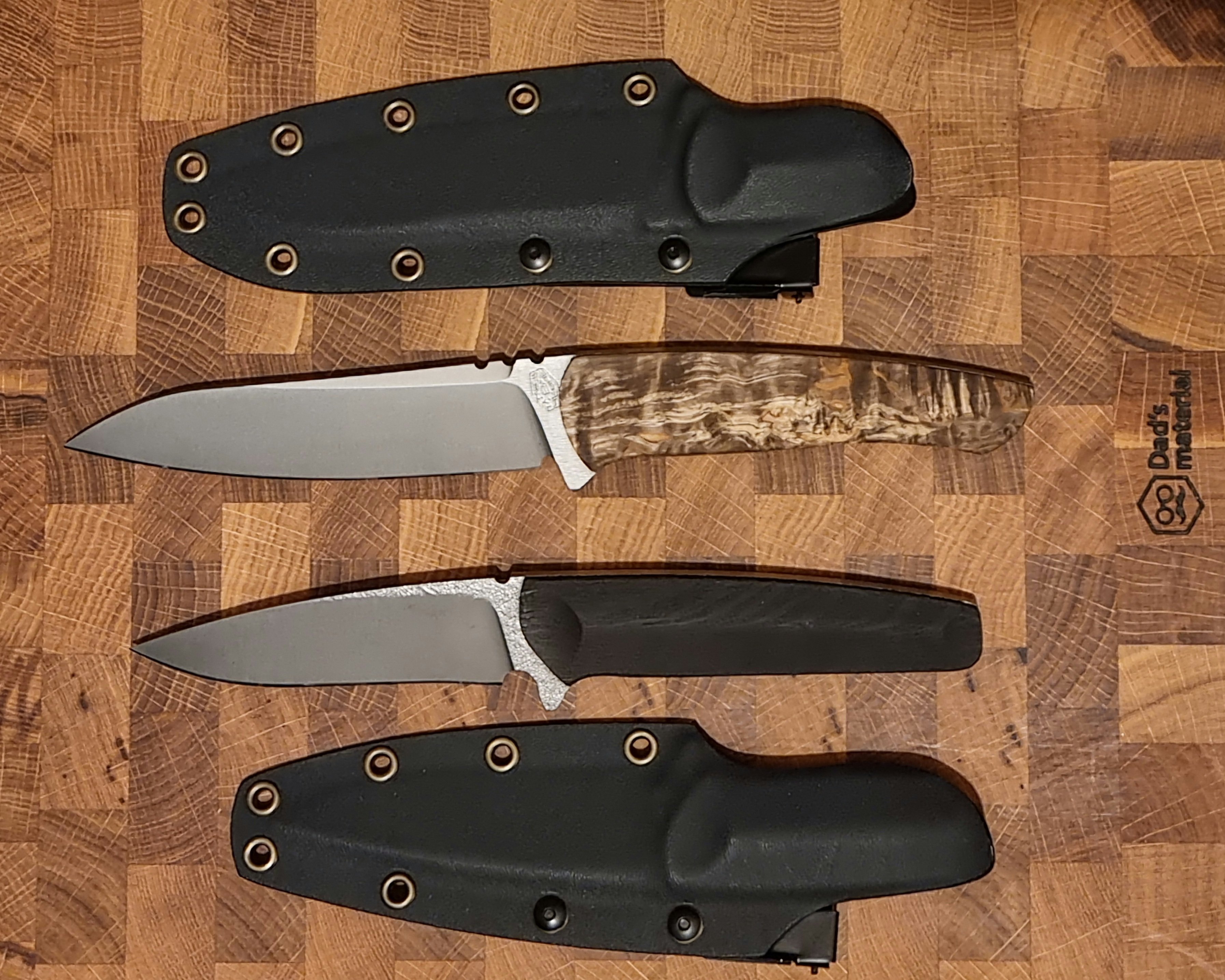 Пара изделий из 440С, фуллтанги, а кайдексе. ТМО стали по технологии Уракова, должна давать 61+ твёрдости. Заточены тоже шикарно, получше, чем в первом заказе. Корелка и граб, соответственно. Очень интересны и самобытные изделий, не могут не отметить. В руке вообще очень интересное воспринимаются. Шамилю благодарность за его отношение к клиенту.