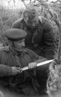 БАРАБАНЩИКОВ РОМАН ИВАНОВИЧ (1912-1942) - снайпер 8-й отдельной бригады морской пехоты Черноморского флота, старшина 1-й статьи. На фото Роман Иванович делает штык-ножом 18-ю зарубку, отмечая счëт уничтоженных вражеских солдат. Всего на его счету было 150 уничтоженных солдат и офицеров противника.