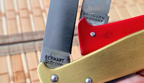 Вот и подоспели к разговору. Брал на е-вау, спросил заранее и продавцы заверили в отсутствии каких-либо люфтов, что и подтвердилось при получении. Монолит, ни шата, ни покачивания. Ну, красная вставка, как мы уже знаем, говорит о том, что нож был сделан до 1995, когда именно, неизвестно. Но компания, чья информация выбита на рукоятке, по указанному адресу давно не существует. Для нового владельца Deutschland über alles то есть Германия превыше всего, потому и Solingen переместился ниже. Но вот от этого коромысло само не опустится вровень с рукояткой, а очень хотелось бы. Можно на досуге заняться тем, что искать отличия в этих ножах, их много, есть и косячки, но вот только стОит ли оно потраченного времени? "Выдру" на карман, красный отложу, ведь нож интересен тем, что владелец компании заморочился не на шутку, проконтактировал с немцами, и те и другие обговорили все детали и цену, немцы сделали изменения в процессе штамповки и всё это только ради рекламы компании заказчика. На е-вау продавец продаёт эти ножи (и маленькие без замка) уже давно, то есть, трудно представить, сколько их было сделано и сколько ещё осталось на складе.