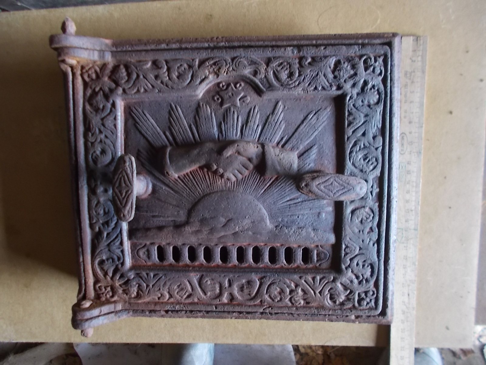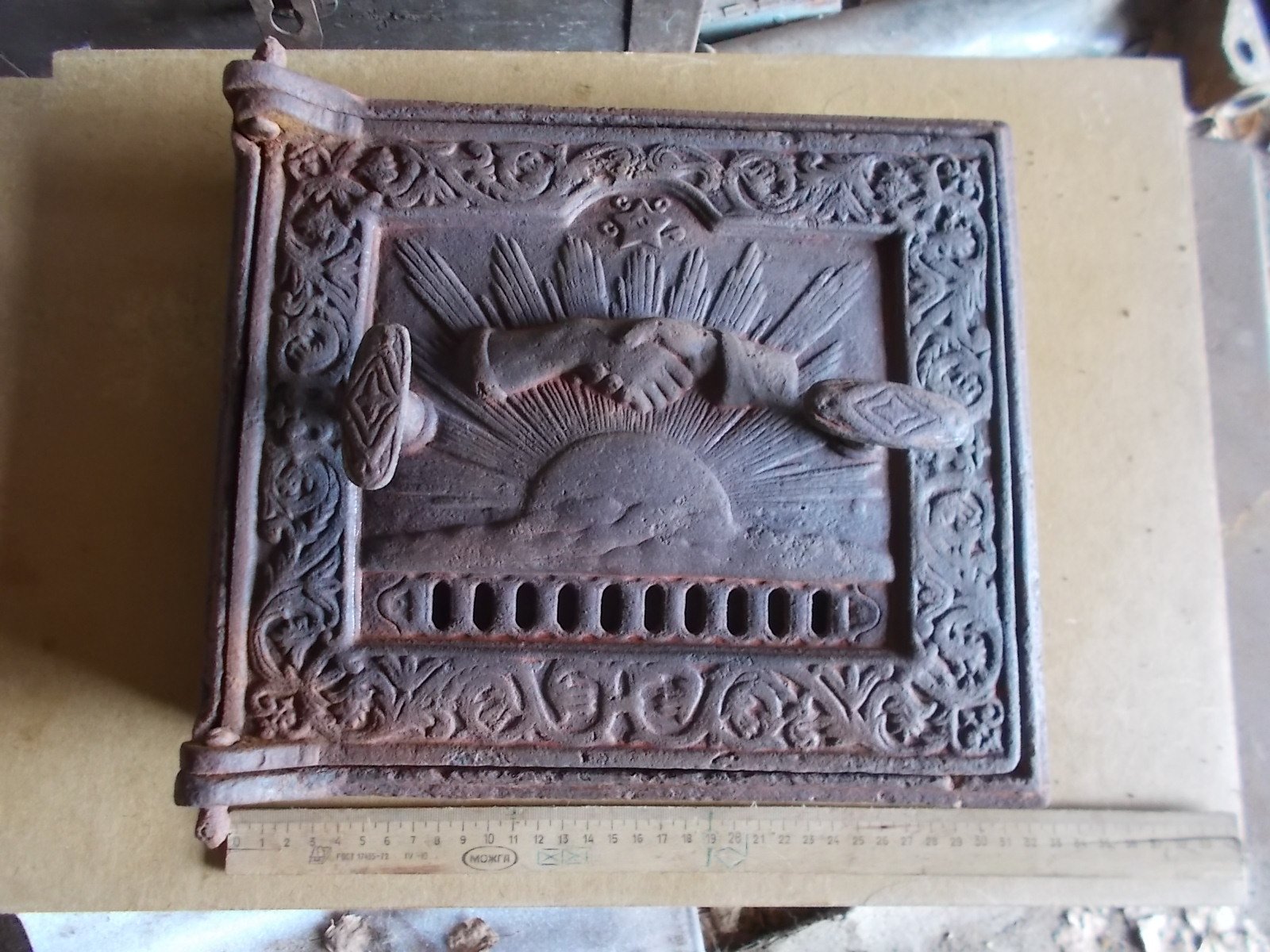 Большая старинная печная дверца  20-30 годы прошлого века ,рельеф глубокий, 320мм на 270 мм ,мерил по выступающим частям , точные размеры-уточняйте-12000 тыс